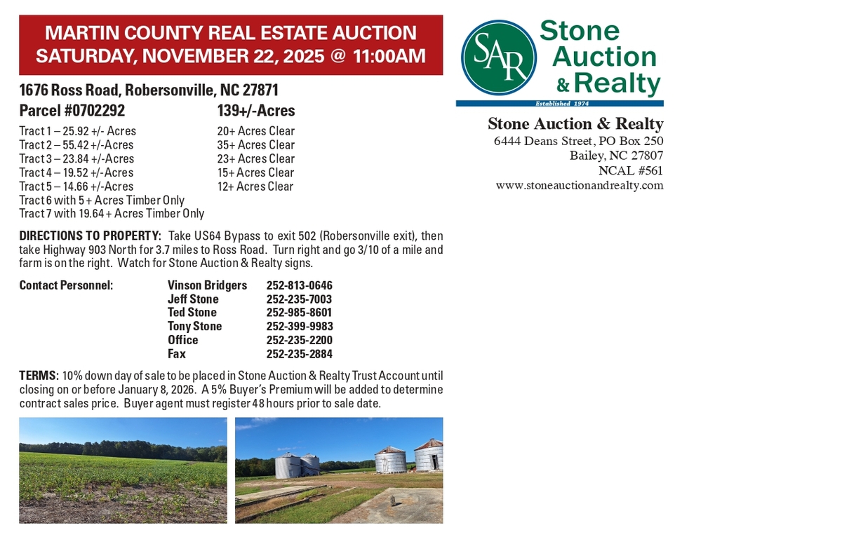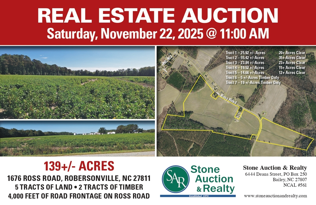 Over the past 45 years, we have conducted hundreds of auctions, specializing in the sale of farmland. We have 3 licensed auctioneers on staff, 2 of whom are the 1989 and 1990 NC State Champion Auctioneers. Through cooperation with a large eastern NC auction firm, we have now added online only auctions to our services and it is the fastest growing segment of our business.